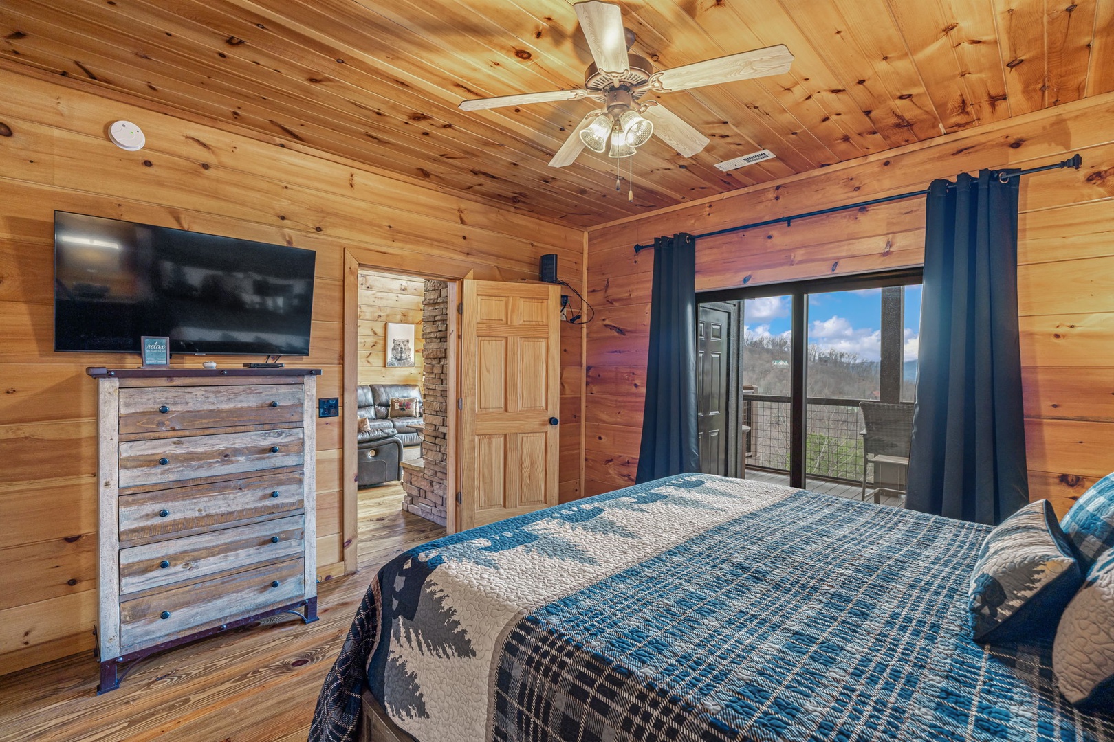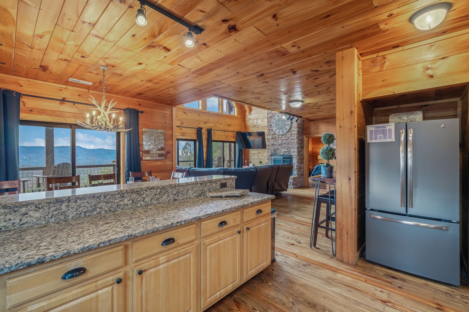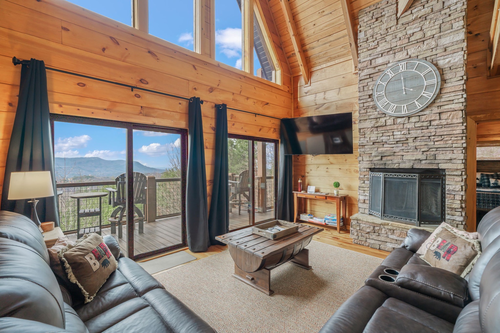 Step outside and enjoy expansive decks with panoramic views, a stone fire pit for s’mores and storytelling, and a fully equipped outdoor kitchen complete with propane grill and pizza oven—perfect for open-air dinners in the mountain air. On cooler nights, gather around the indoor wood-burning fireplace for a classic lodge experience.
