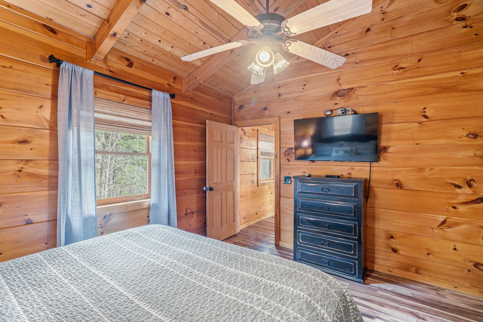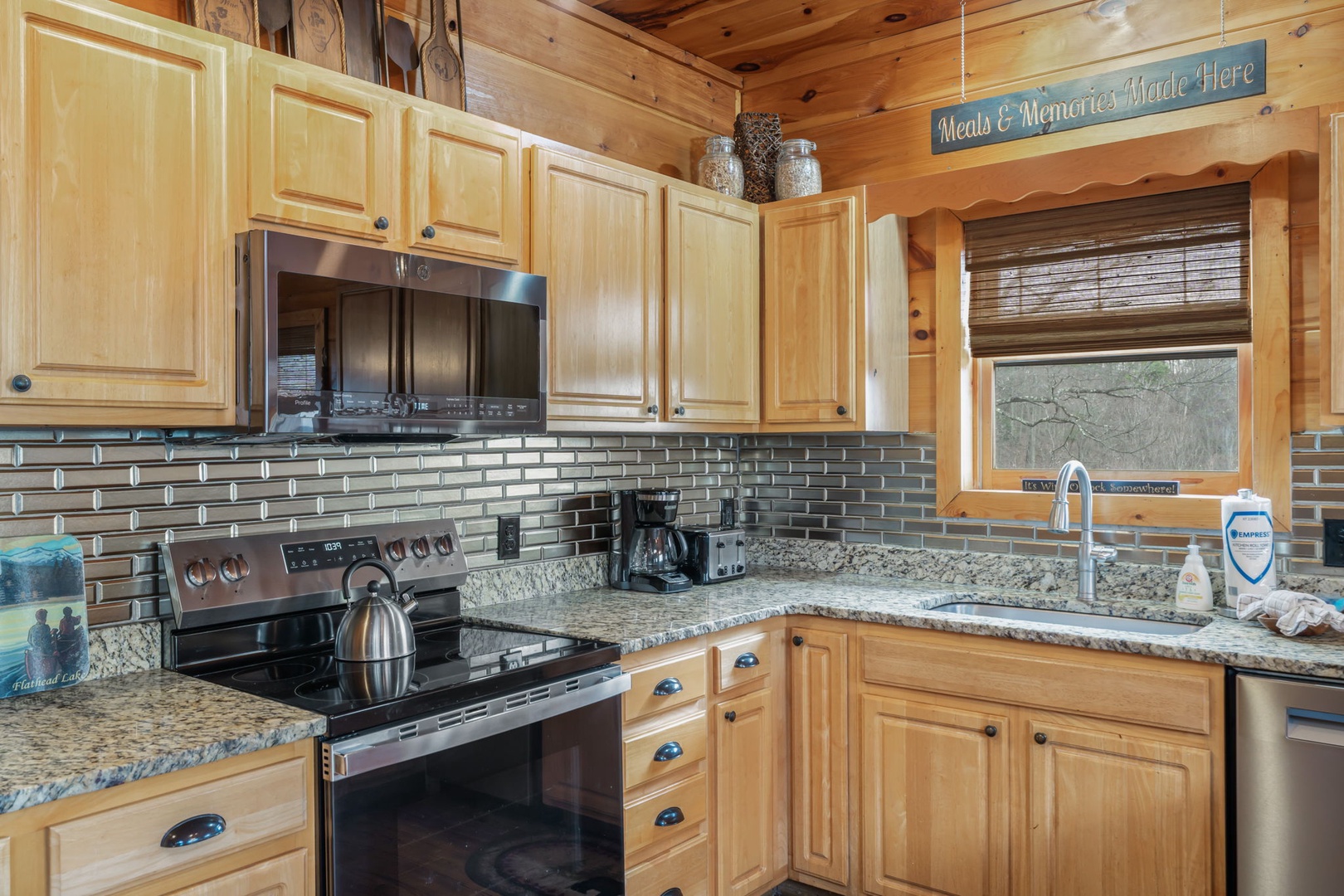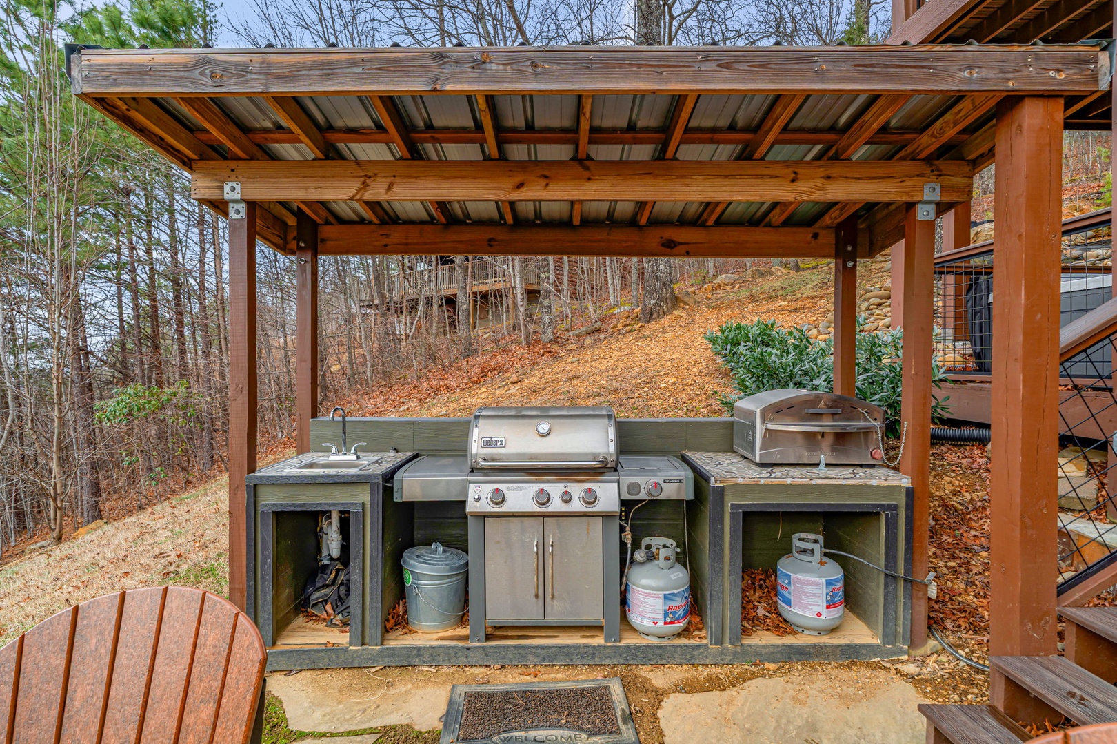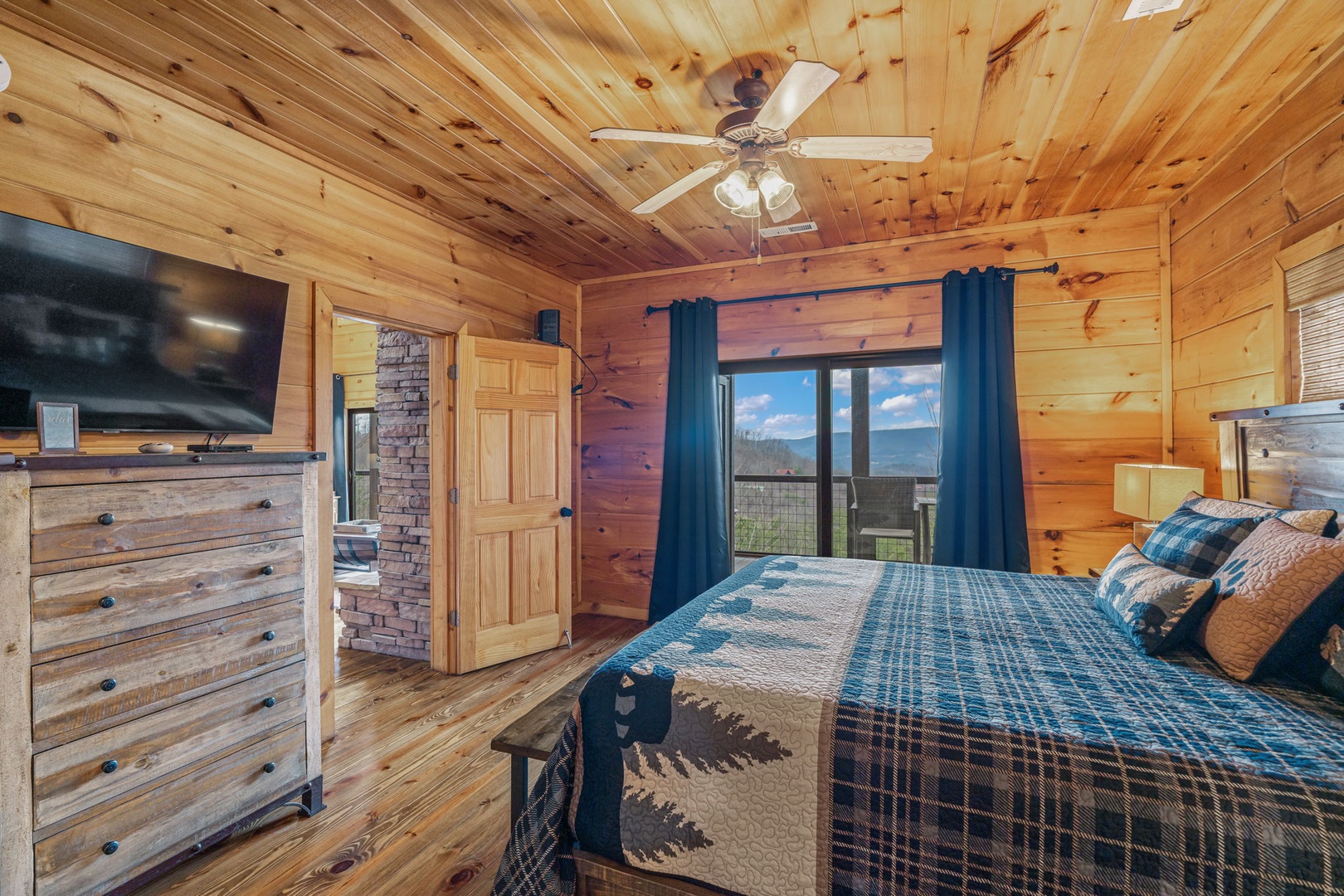 Step outside and enjoy expansive decks with panoramic views, a stone fire pit for s’mores and storytelling, and a fully equipped outdoor kitchen complete with propane grill and pizza oven—perfect for open-air dinners in the mountain air. On cooler nights, gather around the indoor wood-burning fireplace for a classic lodge experience.