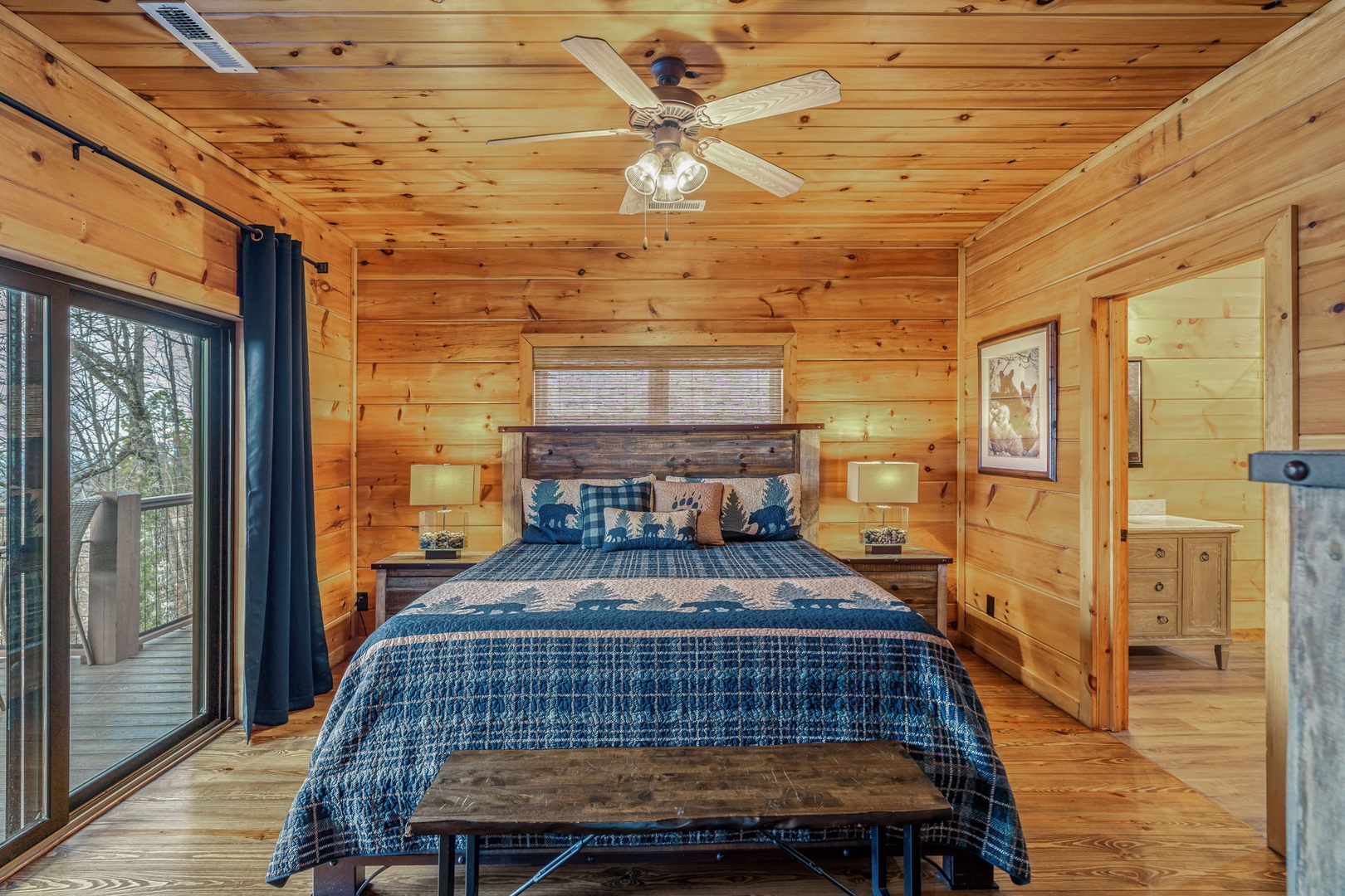 King bedroom with shower/tub combo and balcony access