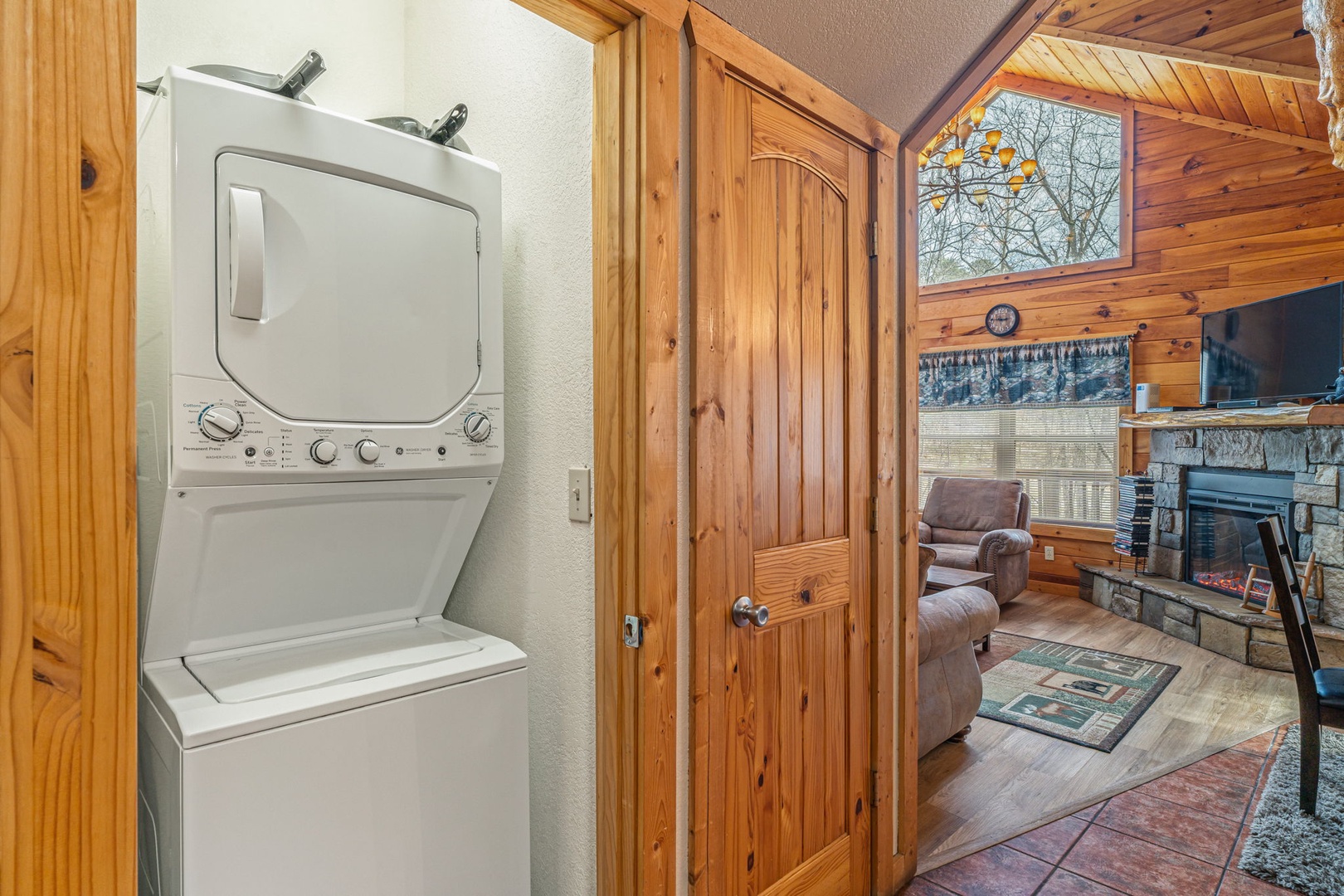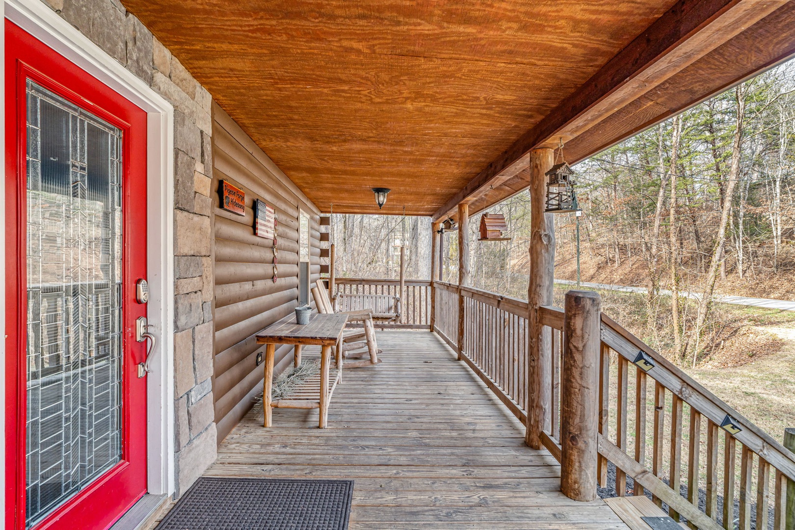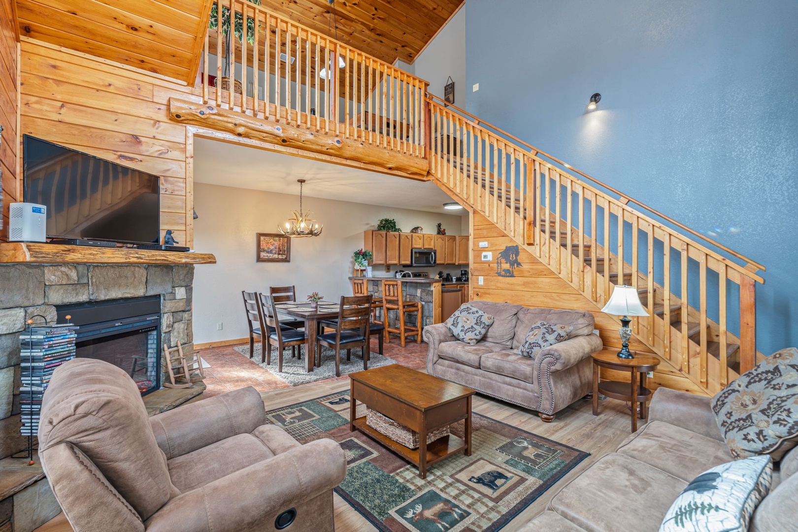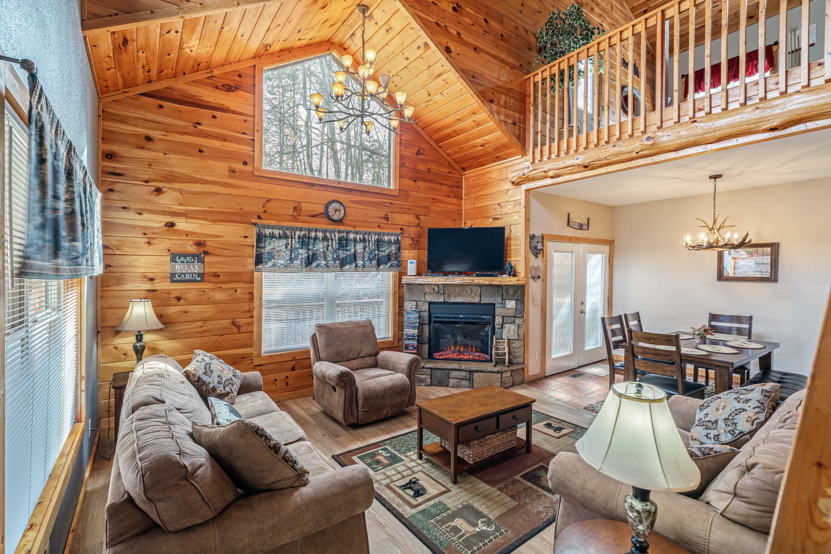 Step inside and you’ll immediately feel relaxed and right at home. This welcoming space provides you with a soaring cathedral ceiling, cozy furnishings, flat-screen TV, a stone fireplace, and deck access.You’re never far from nature here! Stir up a pitcher of sweet tea and head out to a relaxing rocking chair to soak it in!