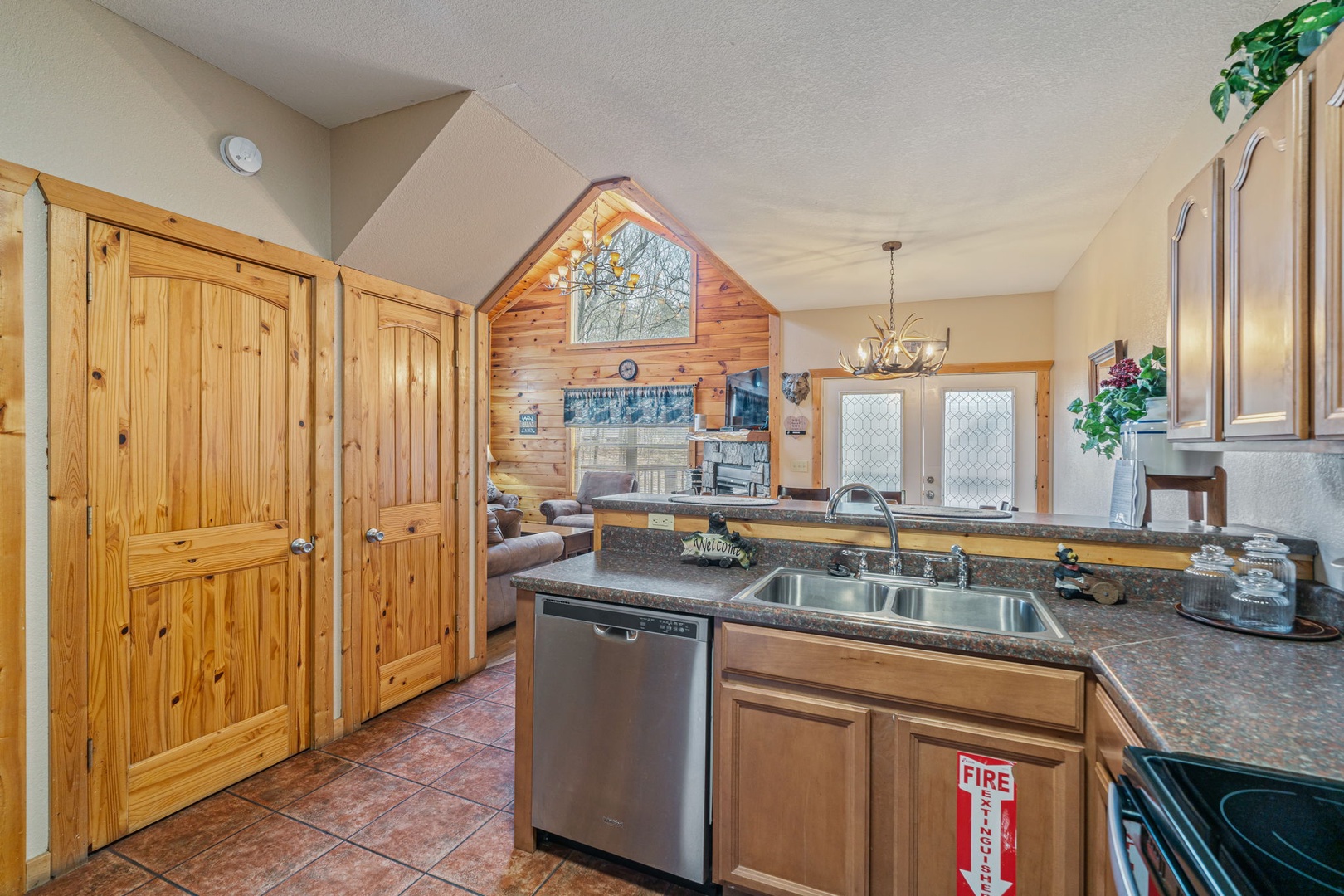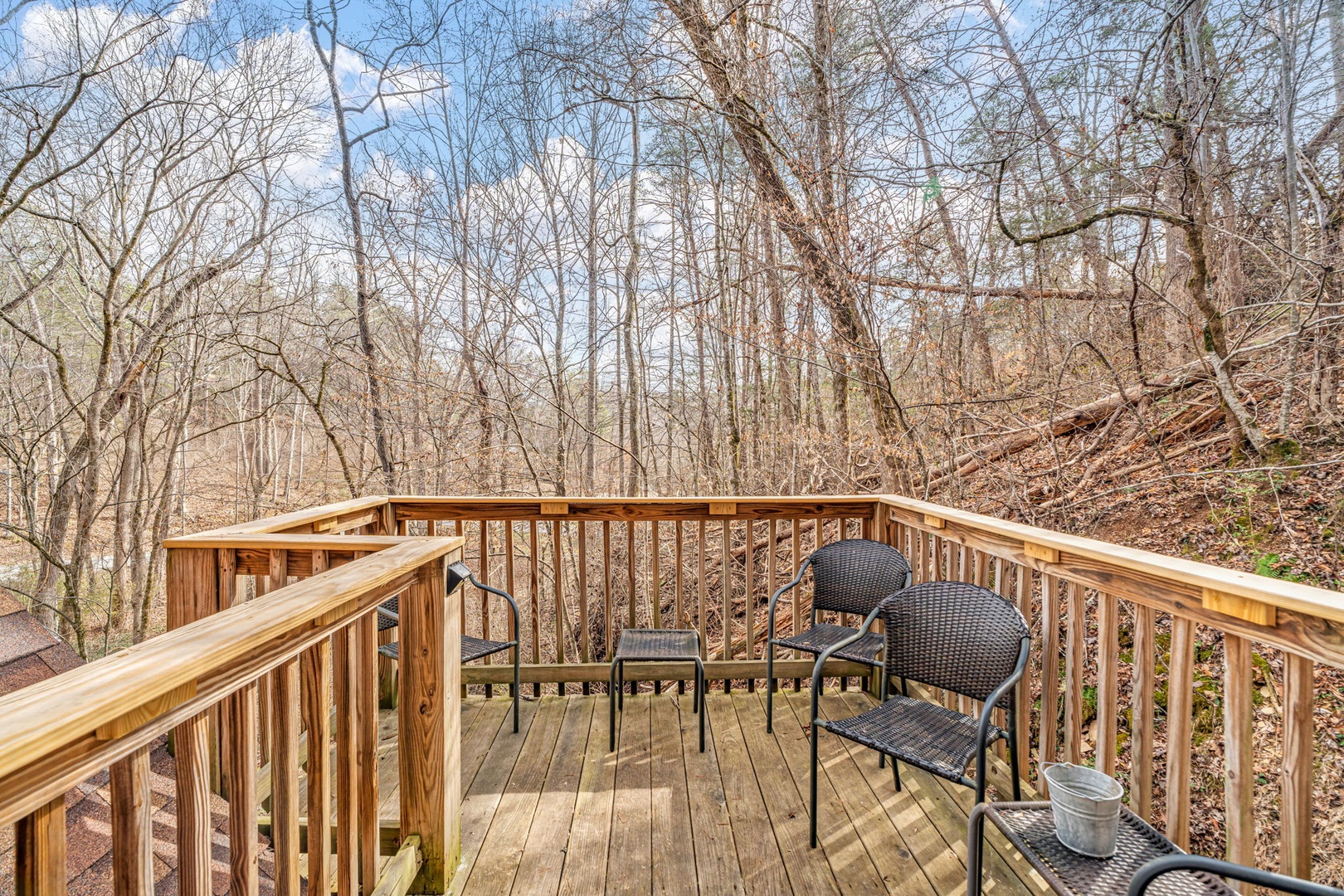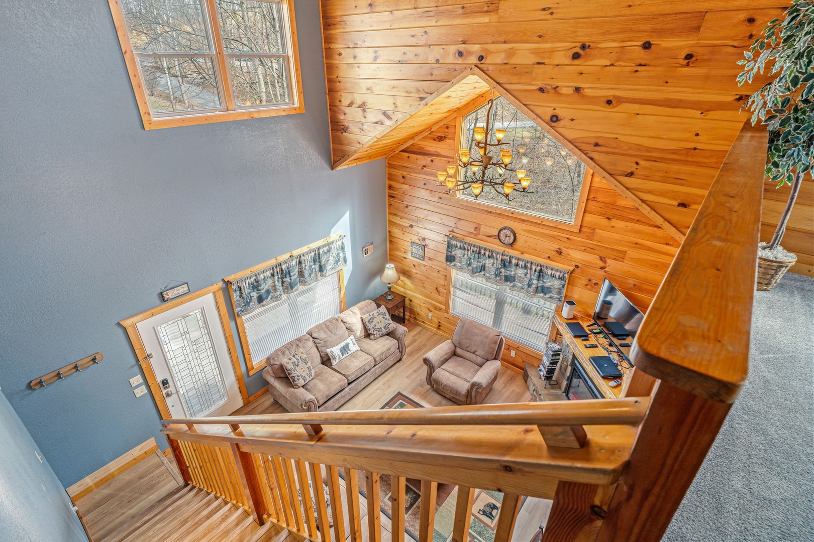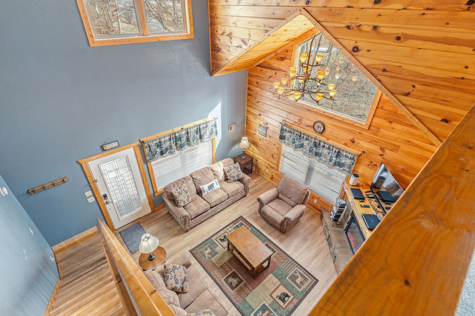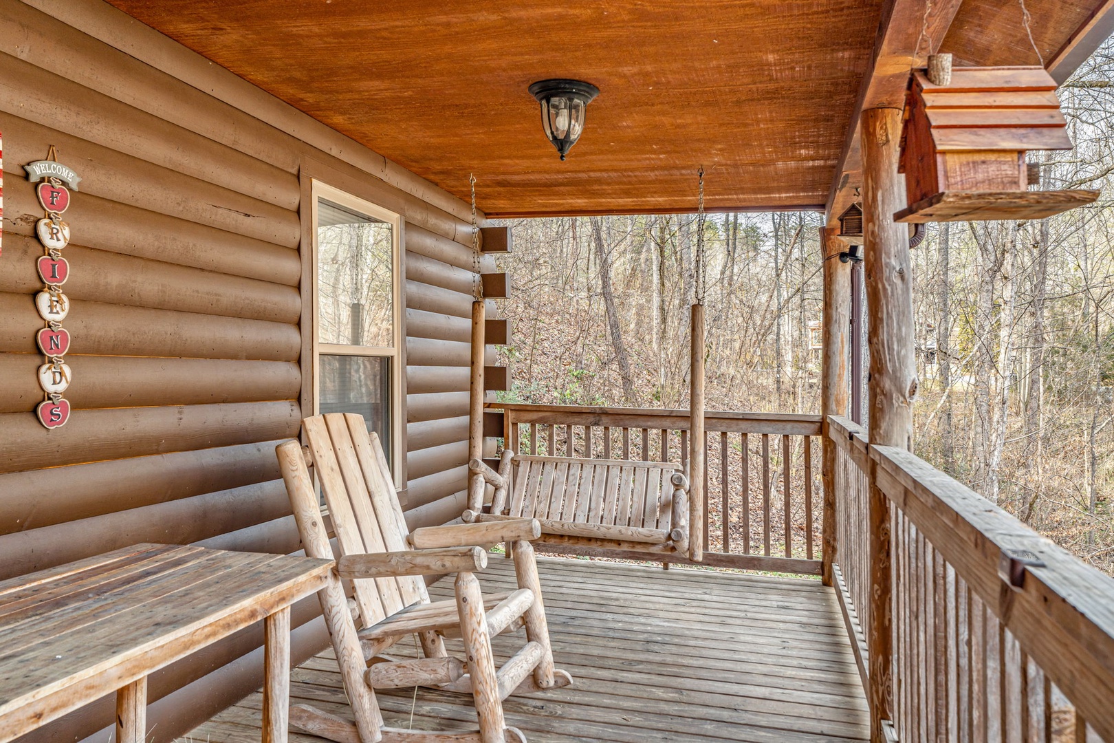 Step inside and you’ll immediately feel relaxed and right at home. This welcoming space provides you with a soaring cathedral ceiling, cozy furnishings, flat-screen TV, a stone fireplace, and deck access.You’re never far from nature here! Stir up a pitcher of sweet tea and head out to a relaxing rocking chair to soak it in!