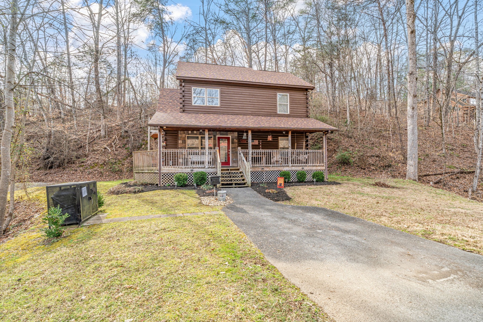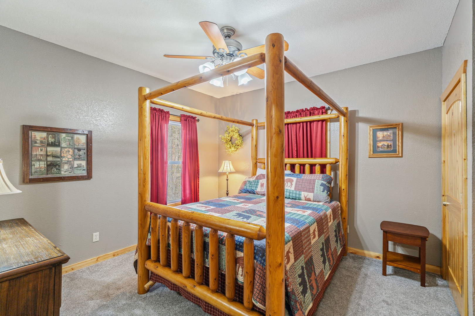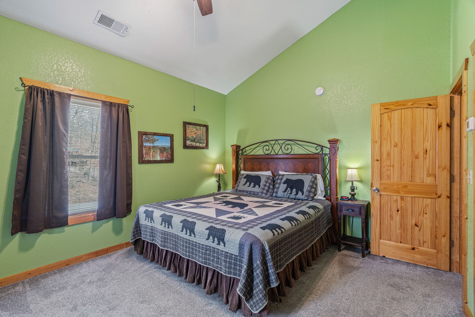 The main level hosts a comfortable queen bedroom with a custom log bed and full bath for added convenience. Open up those windows and sleep in the clean mountain air!