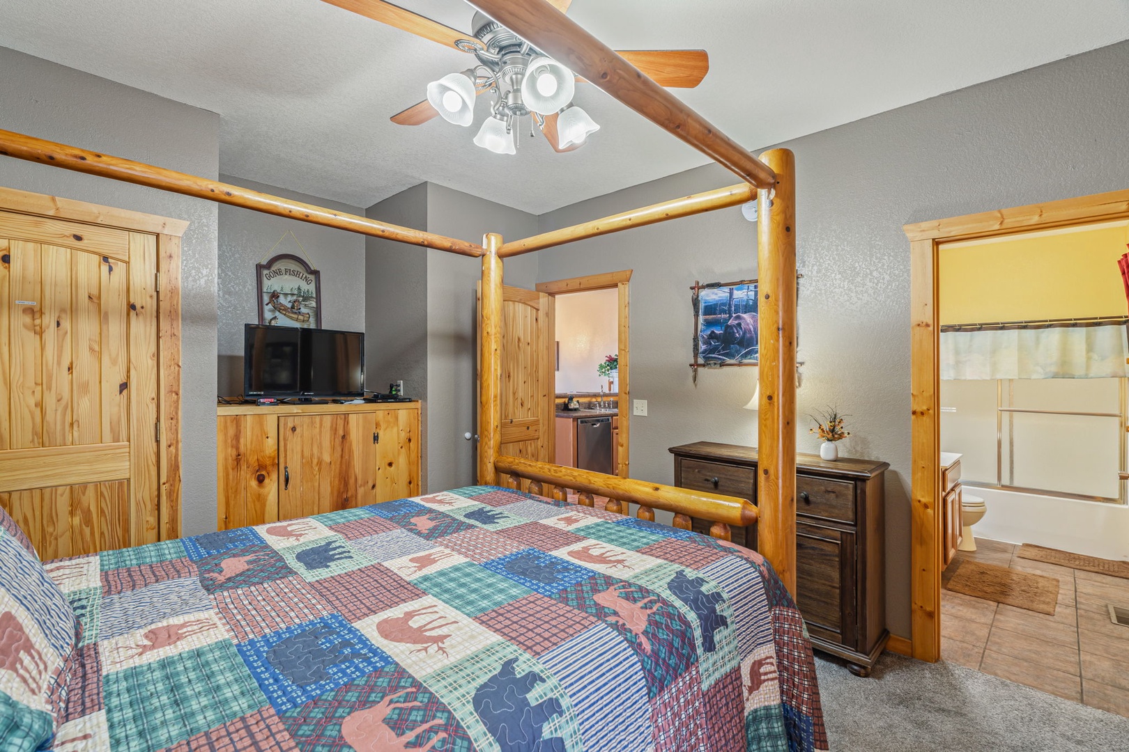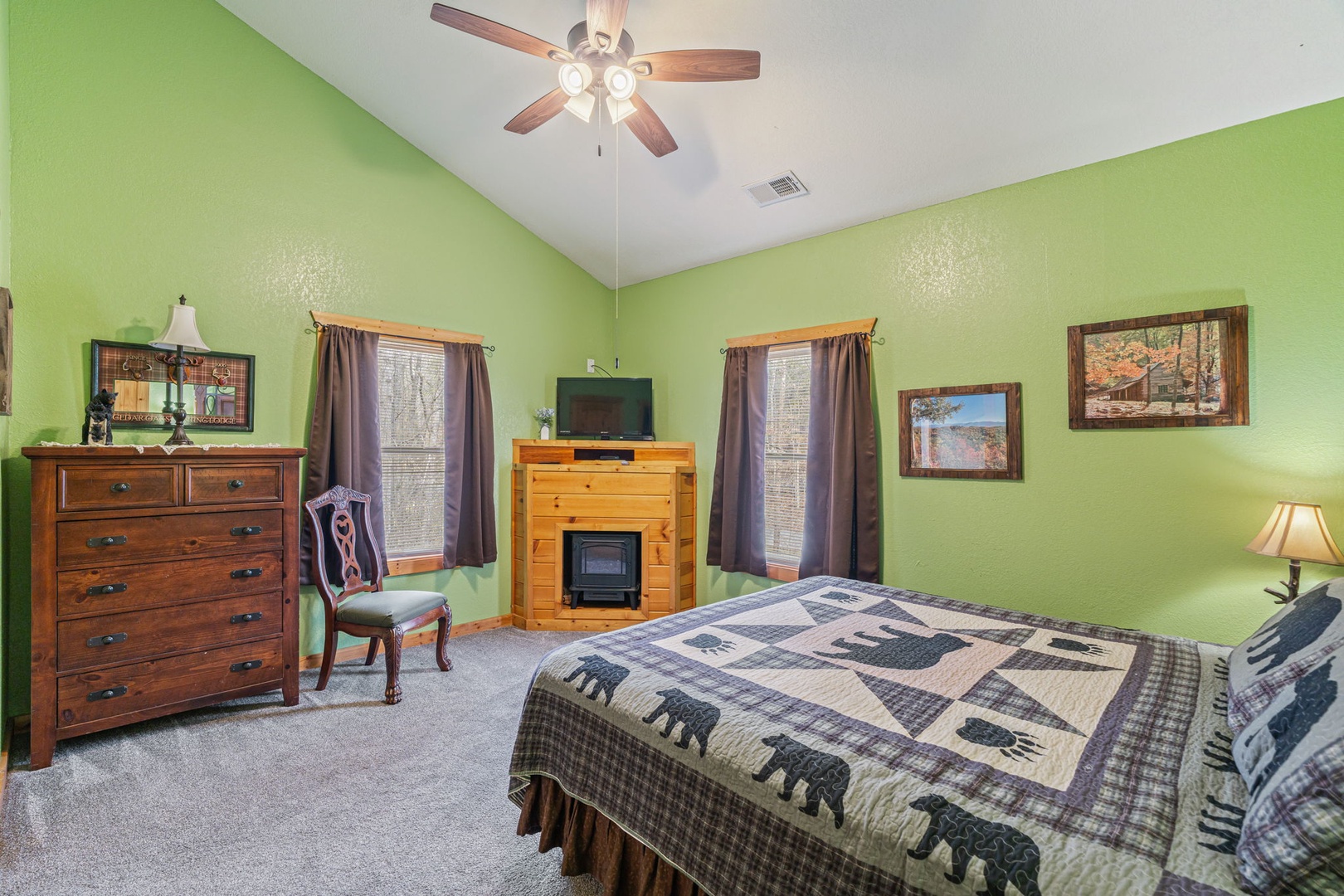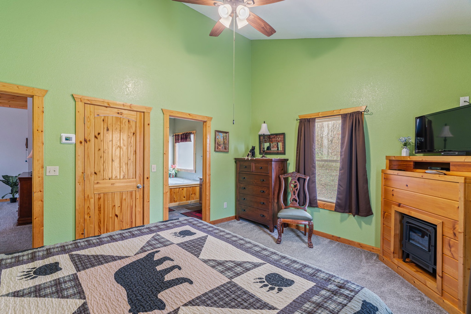 Upstairs, you’ll find the amazing master suite. This bedroom provides you total relaxation with a king bed, cathedral ceiling, fireplace, flat-screen TV, and an en-suite full bath with a soothing jetted tub. This is the perfect place for a little