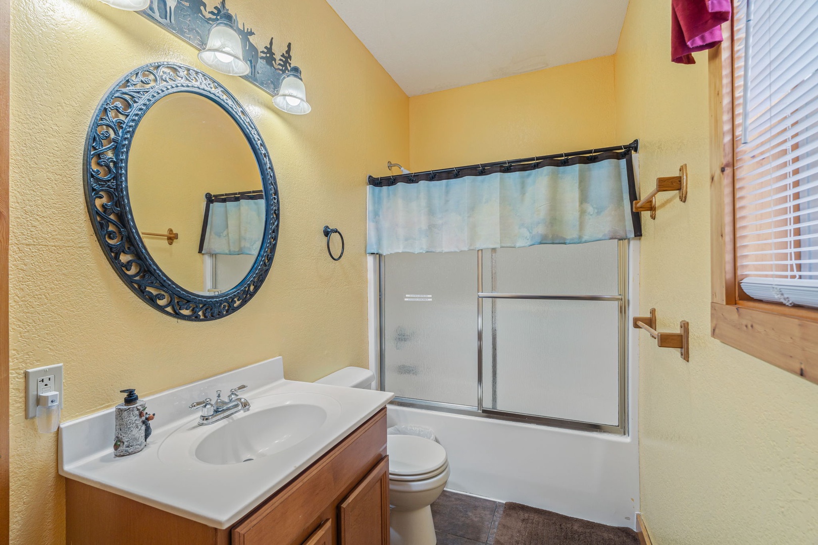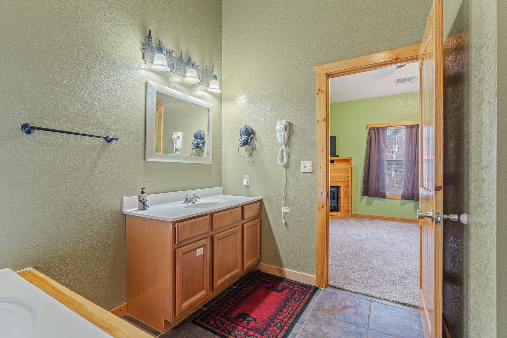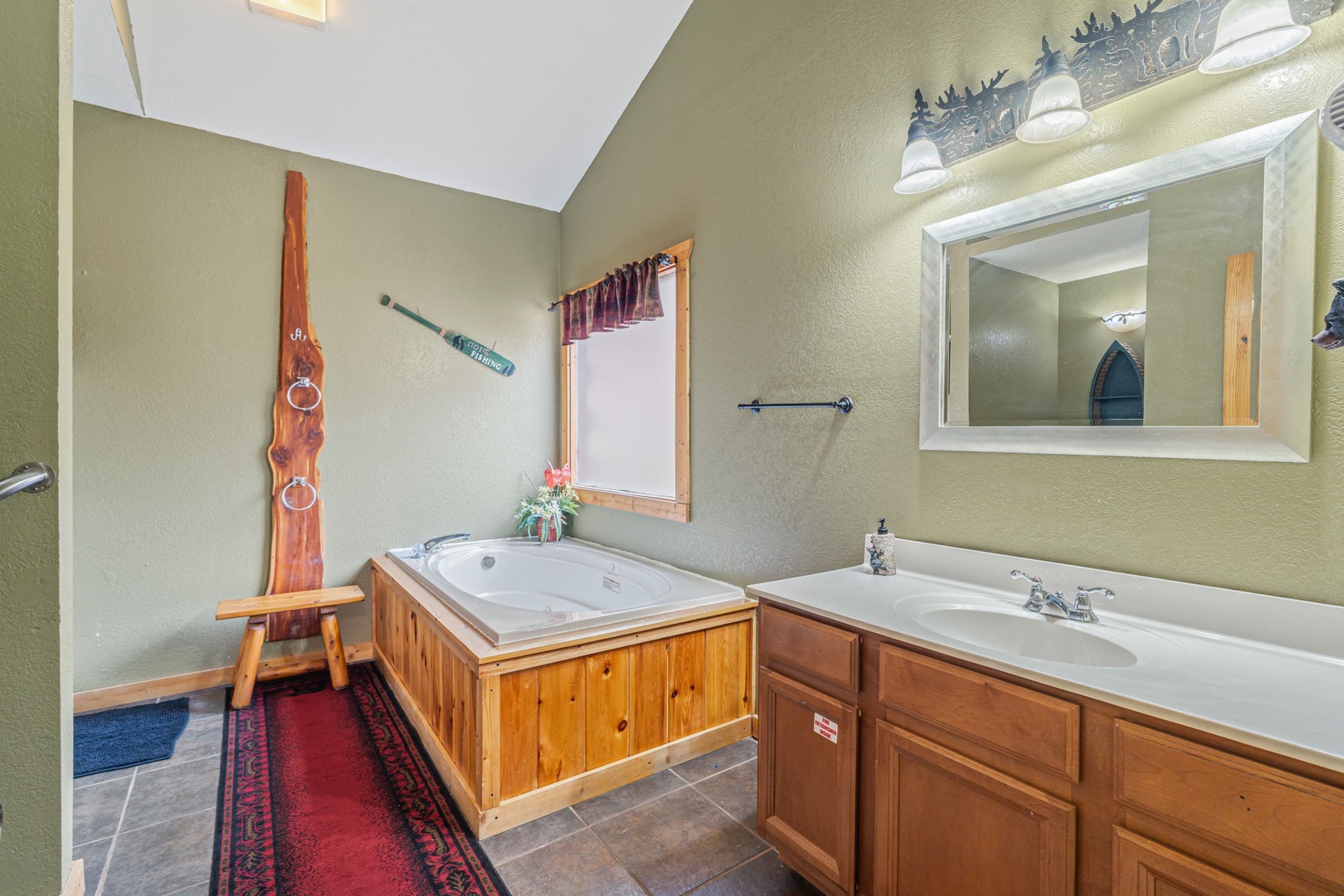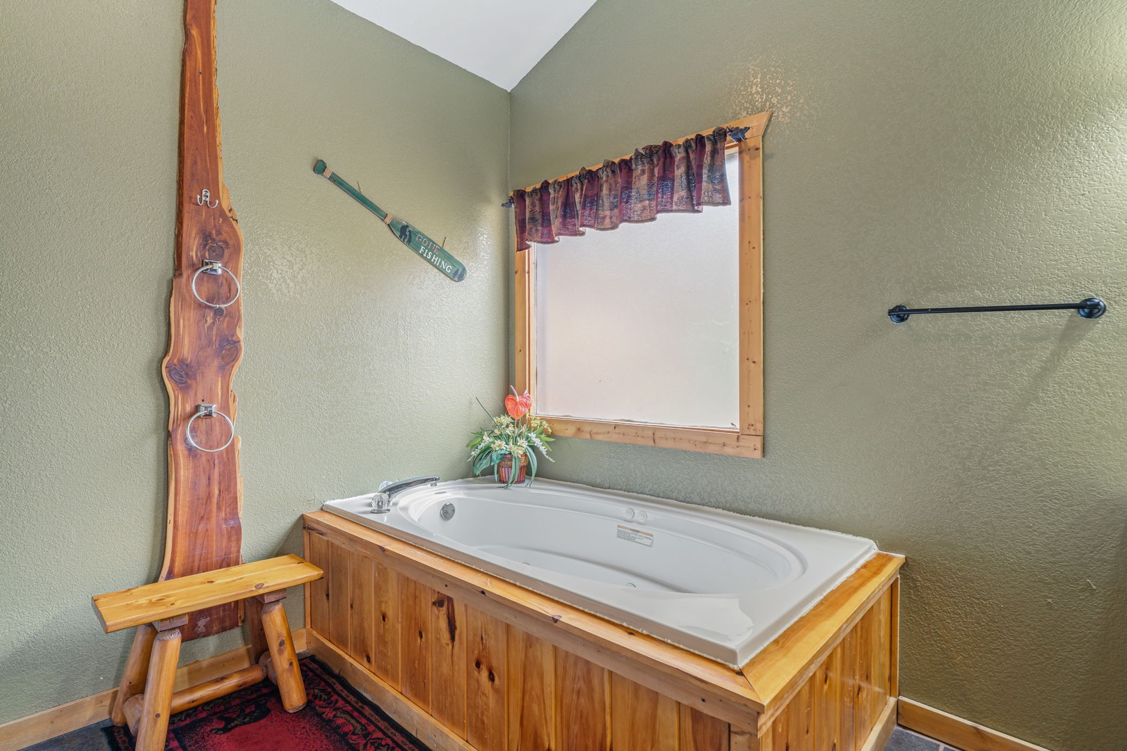 Upstairs, you’ll find the amazing master suite. This bedroom provides you total relaxation with a king bed, cathedral ceiling, fireplace, flat-screen TV, and an en-suite full bath with a soothing jetted tub. This is the perfect place for a little
