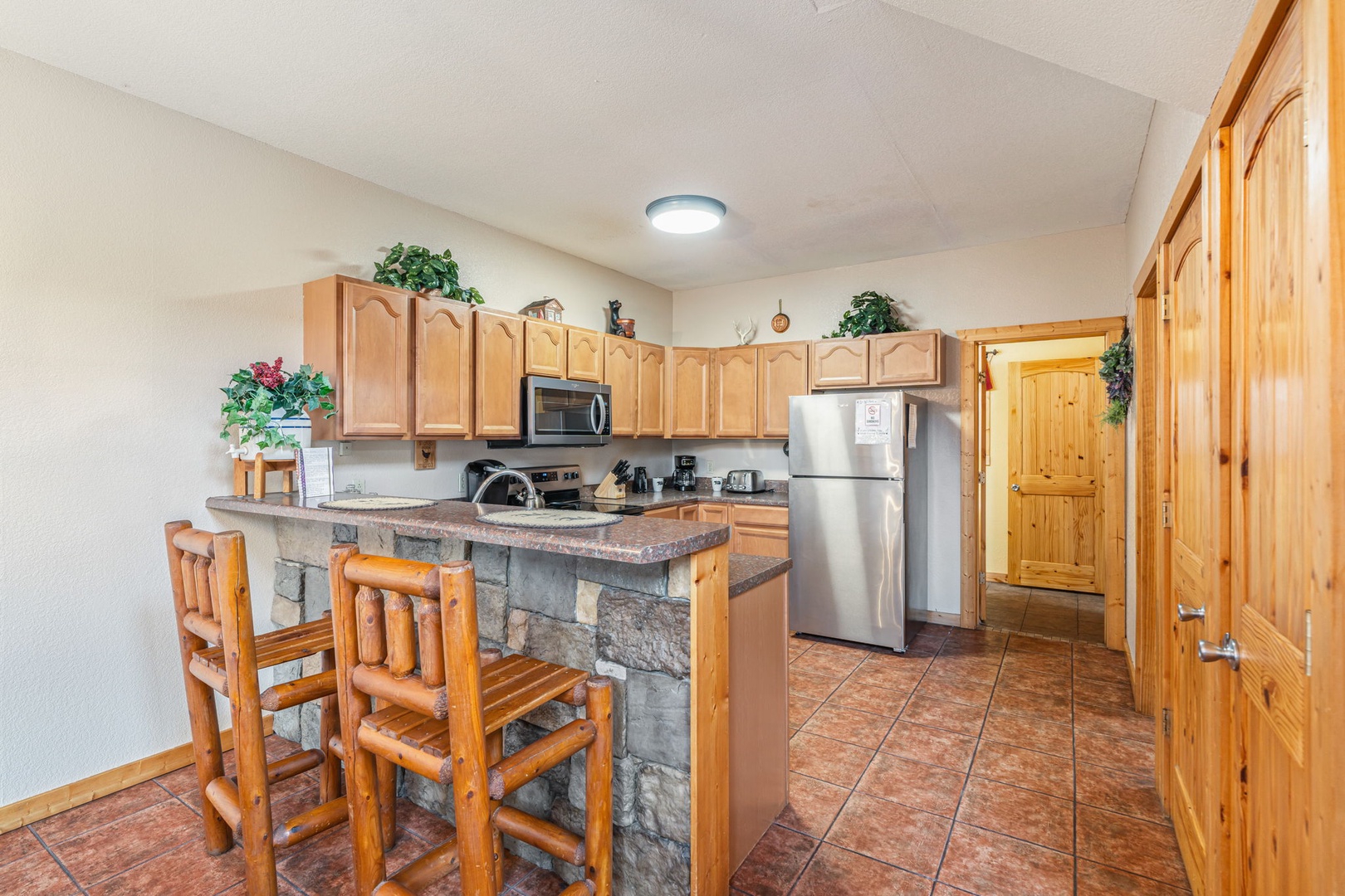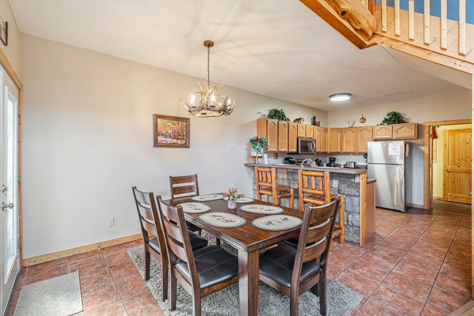 Nearby is a wooden dining table that seats up to six. What a great family space—either for dining or just for chatting! Bring some board games and have a family game night! If you need additional space, the breakfast bar can seat two more!